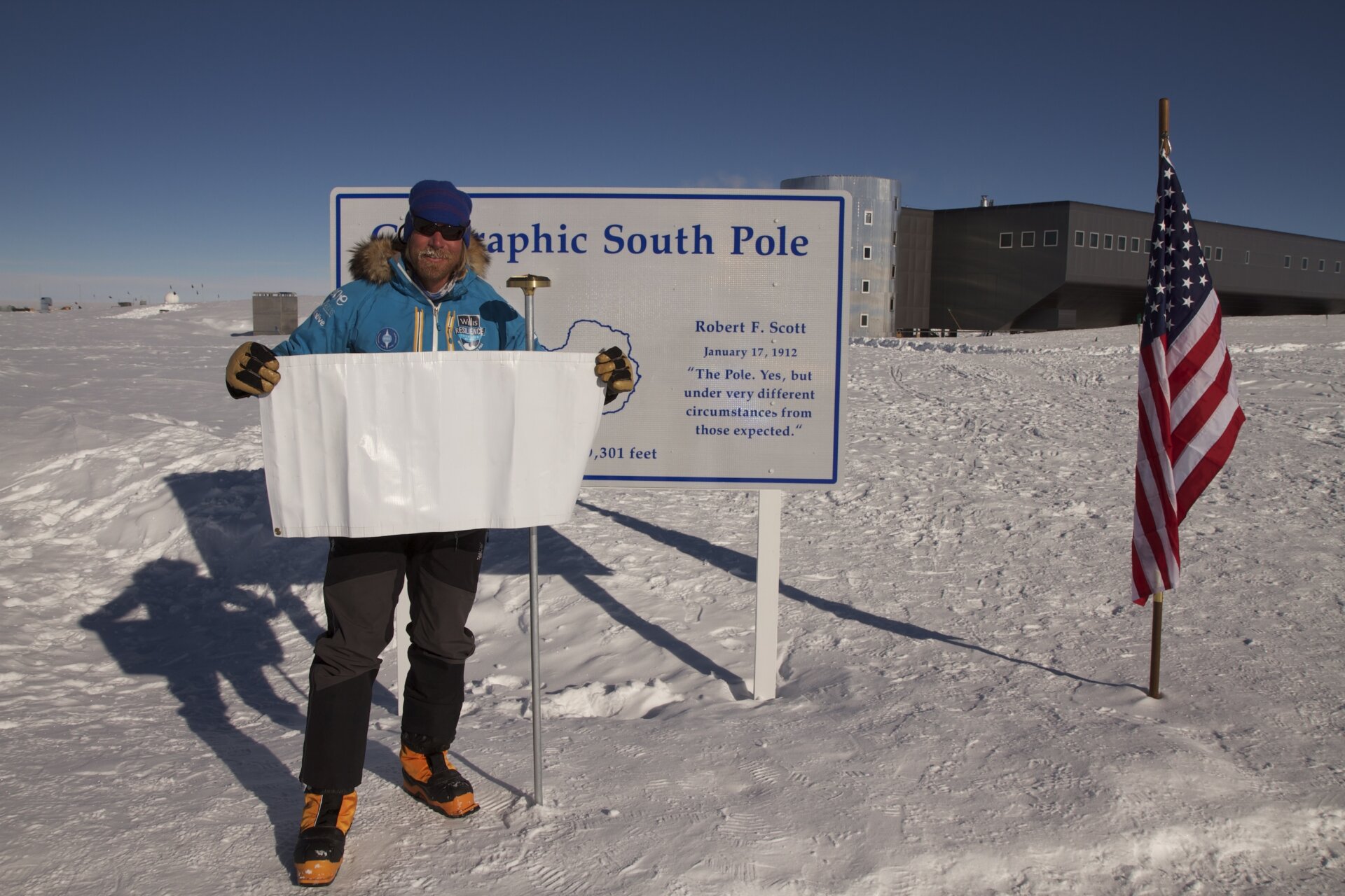 Richard Dunwoody and Doug at the Geographic South Pole in front of the new Amundsen-Scott station.